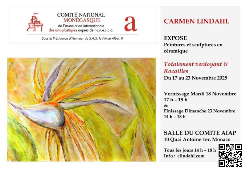 Carmen Lindahl est membre de l’AIAP-UNESCO à Monaco. Elle a participé aux deux dernières expositions annuelles des membres. Elle exposera pour la première fois ses peintures et ses céramiques à la Galerie du Comité. Installée à Menton depuis 2016, Carmen a son atelier dans la vieille ville. Comme beaucoup, elle s’inspire des formes et des couleurs de la nature azuréenne, mais elle en a fait sa propre interprétation et utilise de nouvelles techniques pour réinventer des motifs traditionnels. Carmen a mené sa carrière d’artiste au Luxembourg, à Paris et à Stockholm ces trente dernières années. Elle a toujours exploré de nouvelles façons d’utiliser les techniques de l’huile, de l’encre, de l’aquarelle, de l’estampe et de la sculpture. Avec son exposition actuelle de peinture à l’huile et de sculptures en céramique, elle témoigne son amour pour les couleurs.